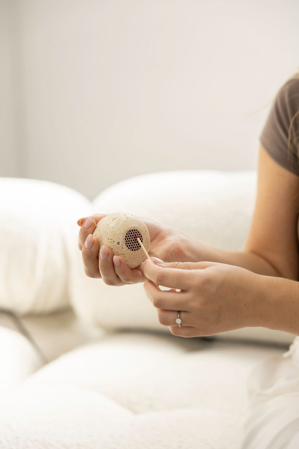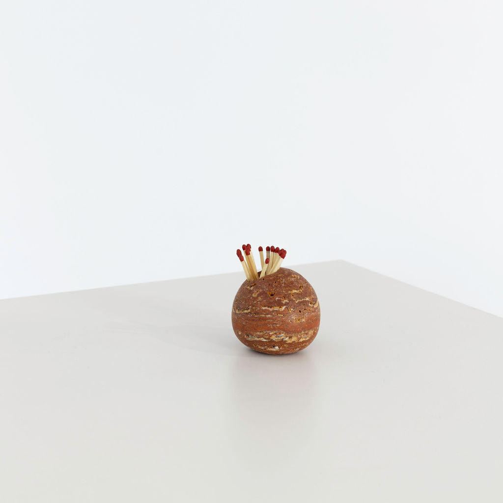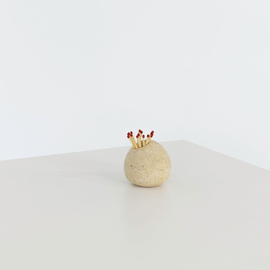 Sculpted from solid stone, Ignis is a refined take on an everyday essential. Its rounded organic form, punctuated by hand-carved openings, cradles matchsticks with ease while doubling as a sculptural accent. Designed to be both functional and ornamental, Ignis invites ritual into your space—whether placed beside a candle or as a quiet statement piece on its own.